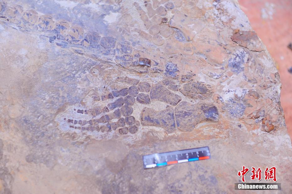 图为新发现的身长1.8米的湖北鳄类化石。中新社记者 刘康 摄