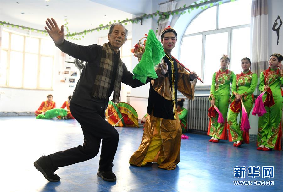 11月20日,在石家庄市井陉县职教中心,井陉拉花代表性传承人武新全在指导学生们练习拉花动作。 新华社发(陈其保 摄)