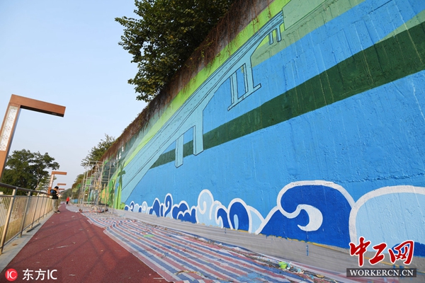 2018年11月28日,广西南宁,绘画人员正在邕江河堤岸的墙壁上涂鸦绘画。图片来源:东方IC