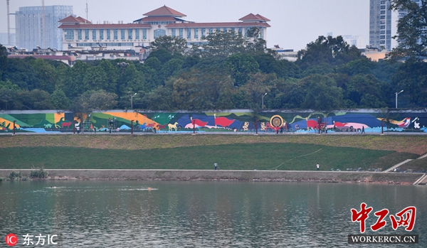 2018年11月28日,广西南宁,绘画人员正在邕江河堤岸的墙壁上涂鸦绘画。图片来源:东方IC
