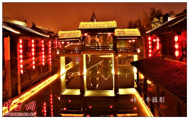 中工网讯 2019年1月12日晚,走进台儿庄古城。这里位于京杭大运河的中心点,坐落于山东省枣庄市台儿庄区。古城肇始于秦汉,发展于唐宋,繁荣于明清,有“天下第一庄”之称,也有“中国最美水乡”之誉。被世界旅游组织称为“活着的古运河”、“京杭运河仅存的遗产村庄”。工人日报-中工网许之丰摄影报道