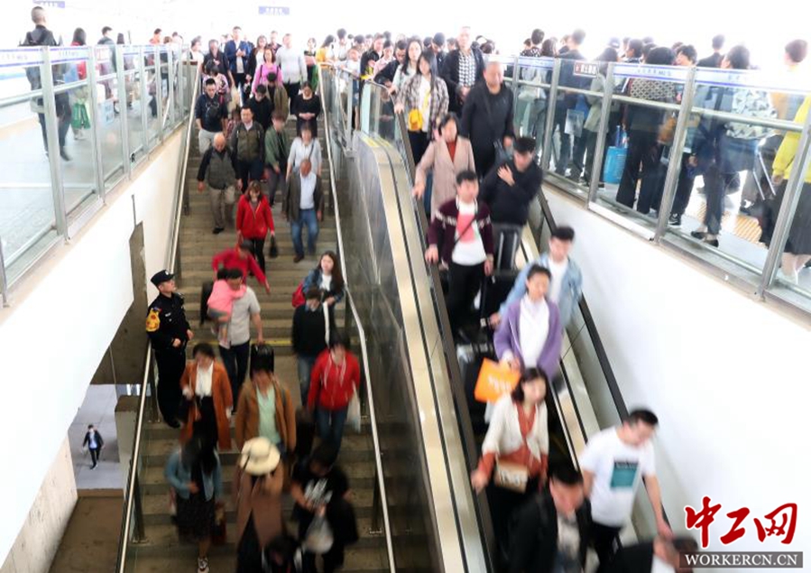 7日,返程旅客正在湖北孝感东站下车出站。当日,湖北铁路迎来清明小长假返程客流高峰。