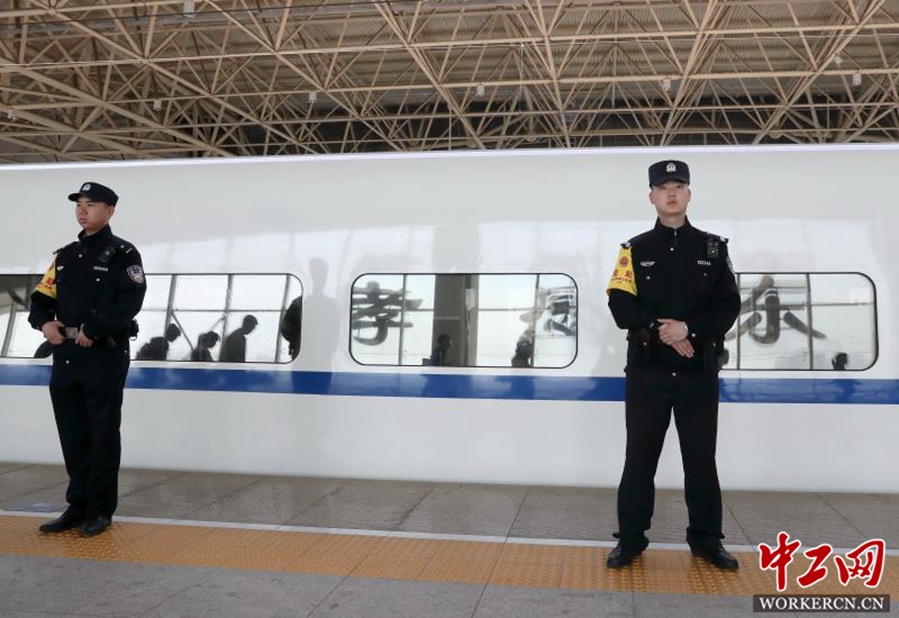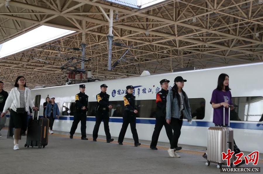 7日,武汉铁路民警正在湖北孝感东站巡逻。当日,湖北铁路迎来清明小长假返程客流高峰。
