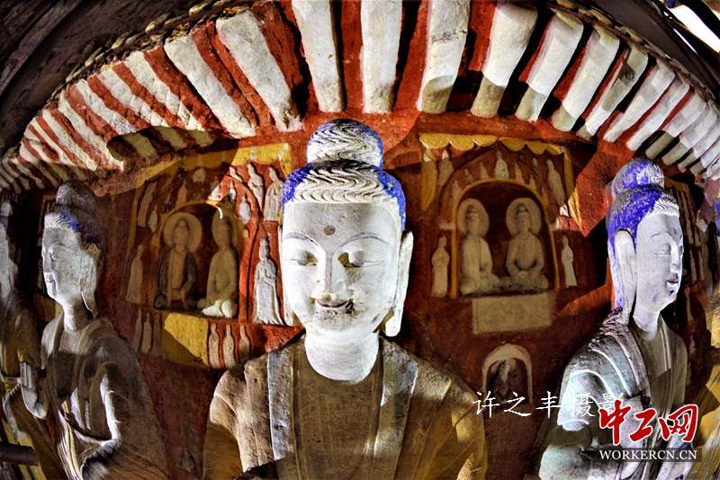 云冈石窟距今已有1500多年的历史,它始建于公元460年。位于山西省大同市,石窟依山开凿,东西绵延1公里。存有主要洞窟45个,大小窟龛252个,石雕造像51000余躯,为中国规模最大的古代石窟群之一。作者站在云梯上拍摄云冈石雕。工人日报-中工网许之丰摄影报道