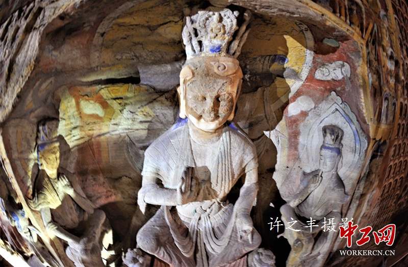 云冈石窟距今已有1500多年的历史,它始建于公元460年。位于山西省大同市,石窟依山开凿,东西绵延1公里。存有主要洞窟45个,大小窟龛252个,石雕造像51000余躯,为中国规模最大的古代石窟群之一。作者站在云梯上拍摄云冈石雕。工人日报-中工网许之丰摄影报道