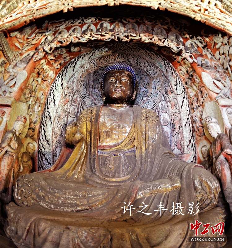 云冈石窟距今已有1500多年的历史,它始建于公元460年。位于山西省大同市,石窟依山开凿,东西绵延1公里。存有主要洞窟45个,大小窟龛252个,石雕造像51000余躯,为中国规模最大的古代石窟群之一。作者站在云梯上拍摄云冈石雕。工人日报-中工网许之丰摄影报道