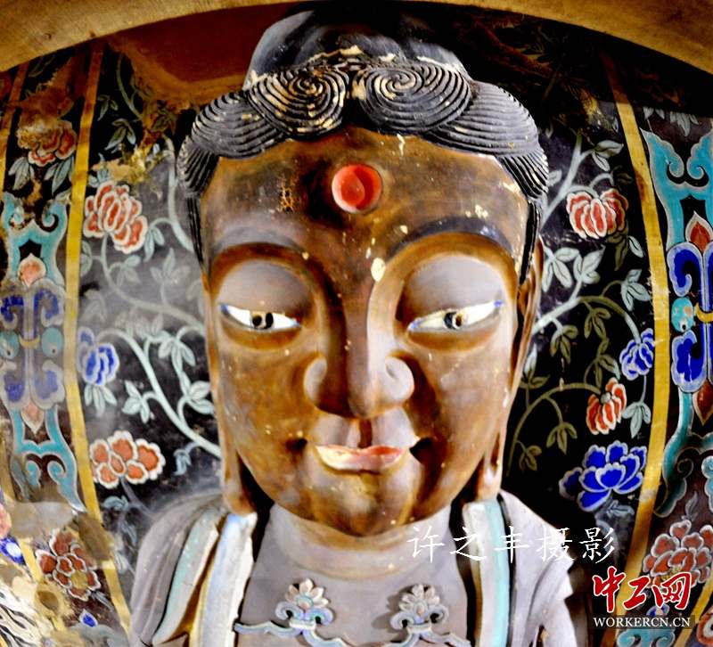 云冈石窟距今已有1500多年的历史,它始建于公元460年。位于山西省大同市,石窟依山开凿,东西绵延1公里。存有主要洞窟45个,大小窟龛252个,石雕造像51000余躯,为中国规模最大的古代石窟群之一。作者站在云梯上拍摄云冈石雕。工人日报-中工网许之丰摄影报道