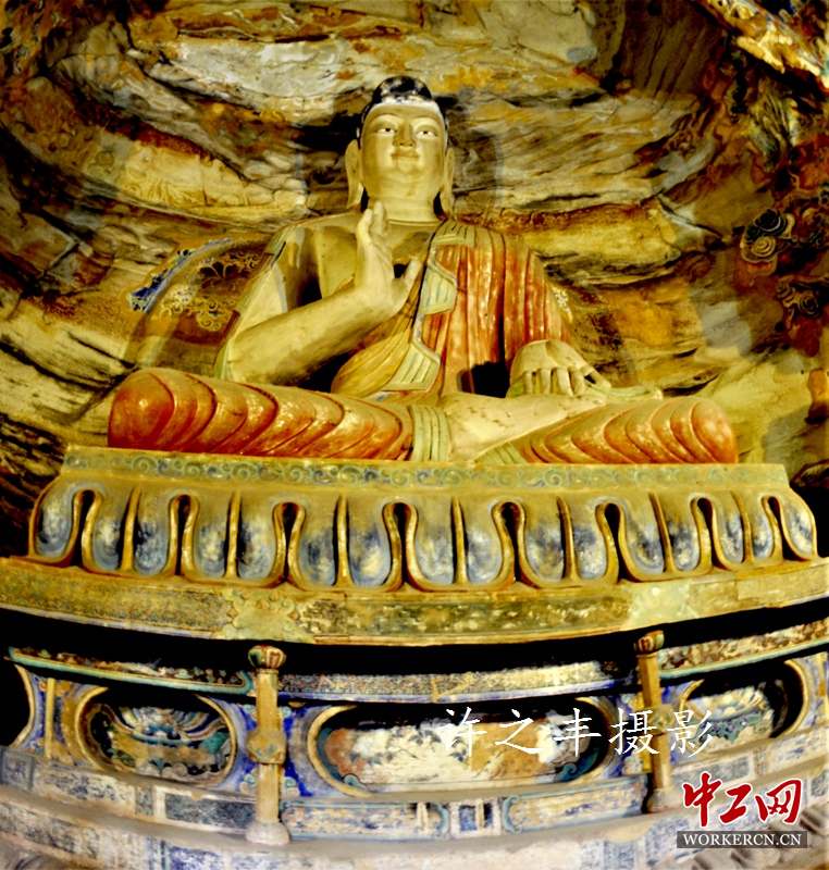 云冈石窟距今已有1500多年的历史,它始建于公元460年。位于山西省大同市,石窟依山开凿,东西绵延1公里。存有主要洞窟45个,大小窟龛252个,石雕造像51000余躯,为中国规模最大的古代石窟群之一。作者站在云梯上拍摄云冈石雕。工人日报-中工网许之丰摄影报道