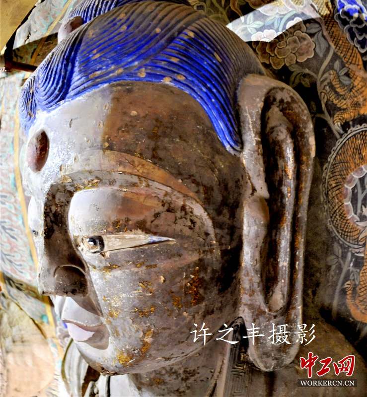 云冈石窟距今已有1500多年的历史,它始建于公元460年。位于山西省大同市,石窟依山开凿,东西绵延1公里。存有主要洞窟45个,大小窟龛252个,石雕造像51000余躯,为中国规模最大的古代石窟群之一。作者站在云梯上拍摄云冈石雕。工人日报-中工网许之丰摄影报道
