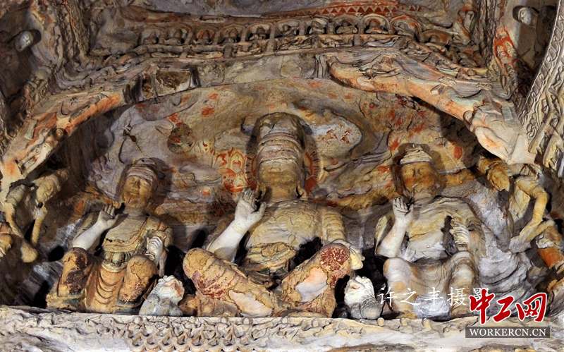 云冈石窟距今已有1500多年的历史,它始建于公元460年。位于山西省大同市,石窟依山开凿,东西绵延1公里。存有主要洞窟45个,大小窟龛252个,石雕造像51000余躯,为中国规模最大的古代石窟群之一。作者站在云梯上拍摄云冈石雕。工人日报-中工网许之丰摄影报道