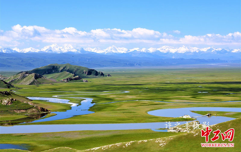 2019年7月26日,走进新疆巴音布鲁克草原,它位于天山山脉的高山间盆地,四周为雪山环抱,海拔约2500米,是一个东西长30公里,南北宽10公里的高源湖泊,面积300多平方公里。这里不但有雪山环抱下的世外桃源,有“九曲十八弯”的开都河,还有优雅迷人的天鹅湖。图为新疆巴音布鲁克草原。工人日报-中工网许之丰摄影报道
