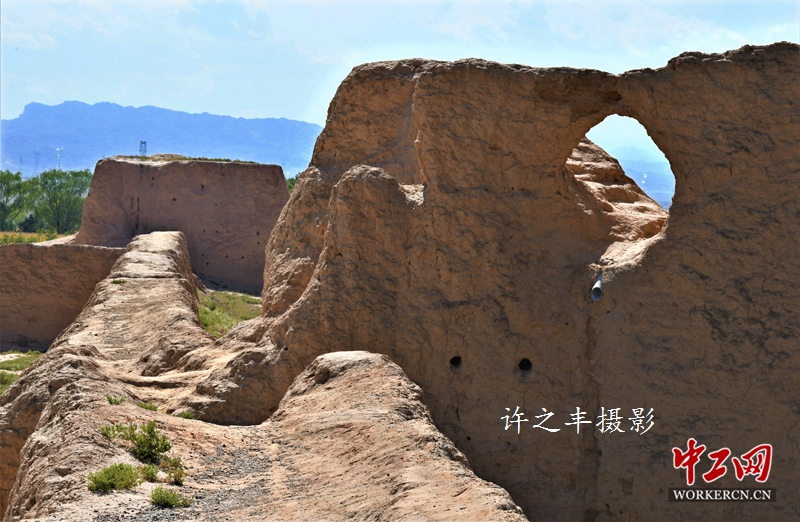 2019年9月28日,沿着明长城西行,走进河西走廊张掖骆驼城遗址。它始建于东晋陲安元年,公元397年。城址坐北向南,平面呈长方形,东西宽425米,南北长704米,面积29.92万平方米。城垣为黄土夯筑,墙基宽6米,残高7米。每一道缺口、每一处凸凹都记录着风雨的洗礼,战火的雕凿。据《重修肃州新志》记载,骆驼城不但是北凉初建时的国都,而且是汉代乐涫县、唐代建康军的故址。工人日报-中工网许之丰摄影报道