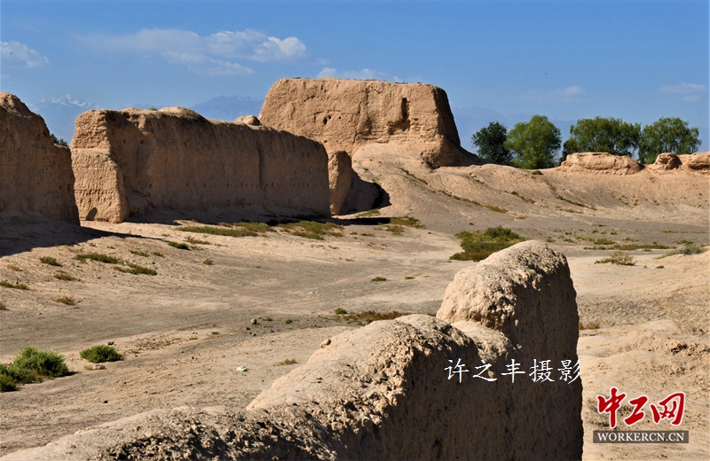 2019年9月28日,沿着明长城西行,走进河西走廊张掖骆驼城遗址。它始建于东晋陲安元年,公元397年。城址坐北向南,平面呈长方形,东西宽425米,南北长704米,面积29.92万平方米。城垣为黄土夯筑,墙基宽6米,残高7米。每一道缺口、每一处凸凹都记录着风雨的洗礼,战火的雕凿。据《重修肃州新志》记载,骆驼城不但是北凉初建时的国都,而且是汉代乐涫县、唐代建康军的故址。工人日报-中工网许之丰摄影报道