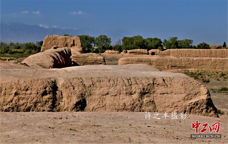 2019年9月28日,沿着明长城西行,走进河西走廊张掖骆驼城遗址。它始建于东晋陲安元年,公元397年。城址坐北向南,平面呈长方形,东西宽425米,南北长704米,面积29.92万平方米。城垣为黄土夯筑,墙基宽6米,残高7米。每一道缺口、每一处凸凹都记录着风雨的洗礼,战火的雕凿。据《重修肃州新志》记载,骆驼城不但是北凉初建时的国都,而且是汉代乐涫县、唐代建康军的故址。工人日报-中工网许之丰摄影报道