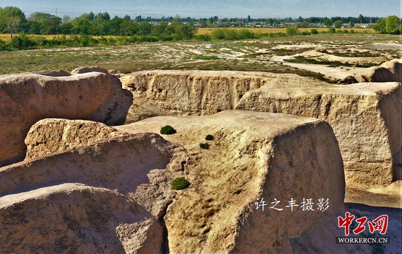 2019年9月28日,沿着明长城西行,走进河西走廊张掖骆驼城遗址。它始建于东晋陲安元年,公元397年。城址坐北向南,平面呈长方形,东西宽425米,南北长704米,面积29.92万平方米。城垣为黄土夯筑,墙基宽6米,残高7米。每一道缺口、每一处凸凹都记录着风雨的洗礼,战火的雕凿。据《重修肃州新志》记载,骆驼城不但是北凉初建时的国都,而且是汉代乐涫县、唐代建康军的故址。工人日报-中工网许之丰摄影报道