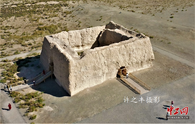 2019年10月1日,沿着古长城西行,走进玉门关遗址,这里地处河西走廊最西端,疏勒河南岸,距敦煌约90公里,西距罗布泊约150公里,四境多戈壁、荒漠、草甸。现遗存包括城址2座,烽燧20座,长城遗址18段。据史书记载玉门关在敦煌郡龙勒县境,为重要的屯兵之地,曾是汉代时期重要的军事关隘和丝路交通要道。工人日报-中工网许之丰摄影报道