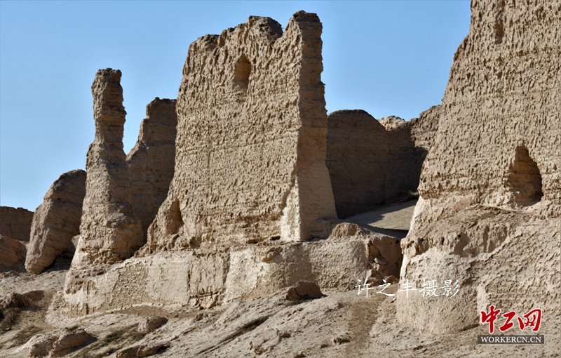 2019年10月1日,沿着古长城西行,走进玉门关遗址,这里地处河西走廊最西端,疏勒河南岸,距敦煌约90公里,西距罗布泊约150公里,四境多戈壁、荒漠、草甸。现遗存包括城址2座,烽燧20座,长城遗址18段。据史书记载玉门关在敦煌郡龙勒县境,为重要的屯兵之地,曾是汉代时期重要的军事关隘和丝路交通要道。工人日报-中工网许之丰摄影报道