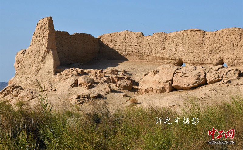2019年10月1日,沿着古长城西行,走进玉门关遗址,这里地处河西走廊最西端,疏勒河南岸,距敦煌约90公里,西距罗布泊约150公里,四境多戈壁、荒漠、草甸。现遗存包括城址2座,烽燧20座,长城遗址18段。据史书记载玉门关在敦煌郡龙勒县境,为重要的屯兵之地,曾是汉代时期重要的军事关隘和丝路交通要道。工人日报-中工网许之丰摄影报道