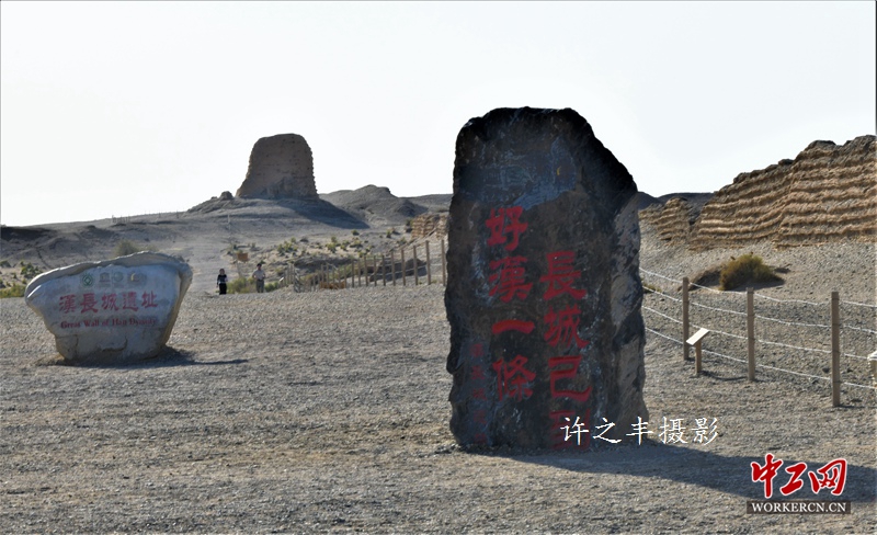 2019年10月1日,沿着古长城西行,走进玉门关遗址,这里地处河西走廊最西端,疏勒河南岸,距敦煌约90公里,西距罗布泊约150公里,四境多戈壁、荒漠、草甸。现遗存包括城址2座,烽燧20座,长城遗址18段。据史书记载玉门关在敦煌郡龙勒县境,为重要的屯兵之地,曾是汉代时期重要的军事关隘和丝路交通要道。工人日报-中工网许之丰摄影报道