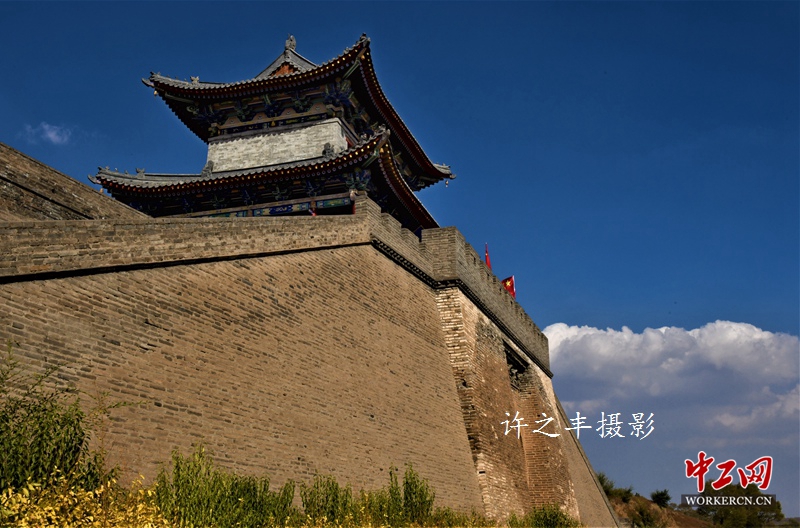 2019年10月10日,走进右卫古城,它位于山西省西北部,北与内蒙古和林格尔县接壤,是山西省的北大门,自古为北方重镇。右卫城下还压着一座城,是春秋战国时期的善无城(今右卫城)。明洪武二十五年(1392年)开始,统治者历时17年,在善无城故址上又筑了这座右卫城,万历三年砖包。右卫城在中国历史上占据其重要的军事地位。图为2019年10月10日的右卫城。工人日报-中工网许之丰摄影报道