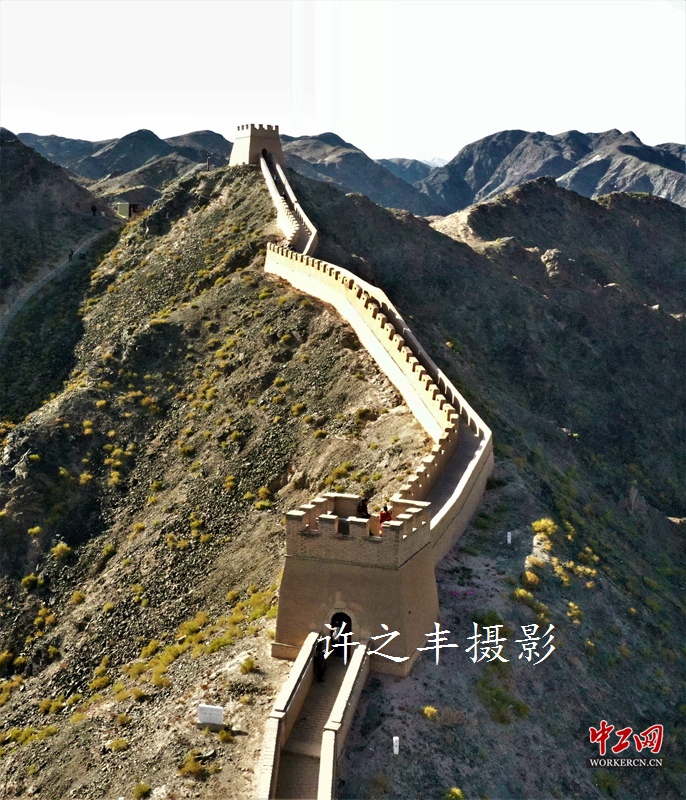 2019年9月29日,作者走进明长城悬壁段,位于嘉峪关关城北8公里处石关峡口的黑山北坡。始建于明嘉靖十八年(1539年)。因筑于约四十五度的山脊之上,形似凌空倒挂,因而得名“悬壁长城”。悬壁长城为嘉峪关西长城的重要地段,古为绿洲戈壁的分野之处,是古丝绸之路的必经关口,河西保障之咽喉,自古为重要的军事防御体系。工人日报-中工网许之丰摄影报道
