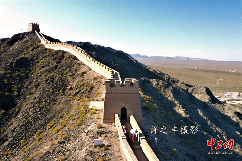 2019年9月29日,作者走进明长城悬壁段,位于嘉峪关关城北8公里处石关峡口的黑山北坡。始建于明嘉靖十八年(1539年)。因筑于约四十五度的山脊之上,形似凌空倒挂,因而得名“悬壁长城”。悬壁长城为嘉峪关西长城的重要地段,古为绿洲戈壁的分野之处,是古丝绸之路的必经关口,河西保障之咽喉,自古为重要的军事防御体系。工人日报-中工网许之丰摄影报道