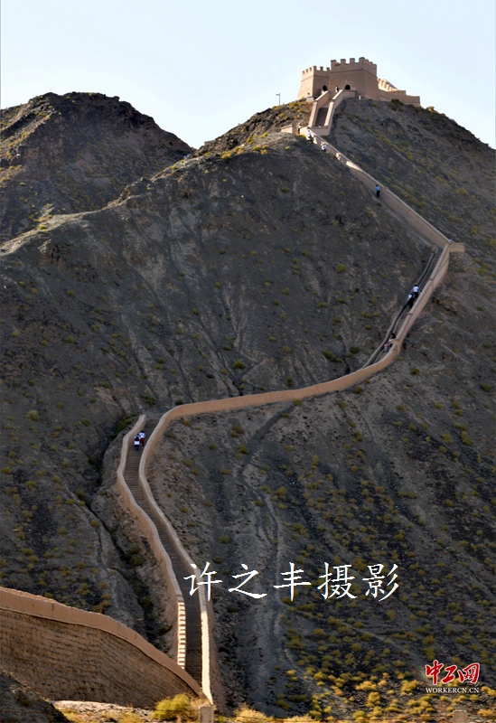 2019年9月29日,作者走进明长城悬壁段,位于嘉峪关关城北8公里处石关峡口的黑山北坡。始建于明嘉靖十八年(1539年)。因筑于约四十五度的山脊之上,形似凌空倒挂,因而得名“悬壁长城”。悬壁长城为嘉峪关西长城的重要地段,古为绿洲戈壁的分野之处,是古丝绸之路的必经关口,河西保障之咽喉,自古为重要的军事防御体系。工人日报-中工网许之丰摄影报道
