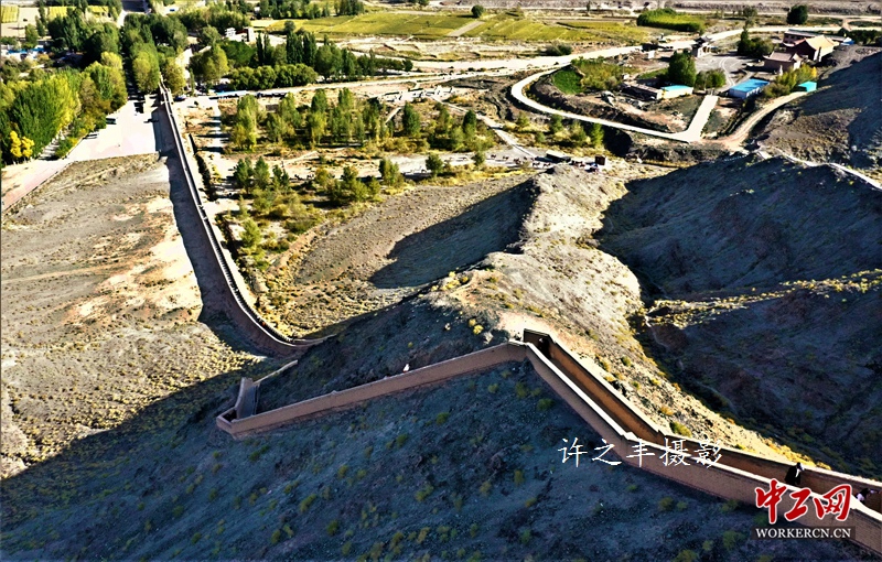 2019年9月29日,作者走进明长城悬壁段,位于嘉峪关关城北8公里处石关峡口的黑山北坡。始建于明嘉靖十八年(1539年)。因筑于约四十五度的山脊之上,形似凌空倒挂,因而得名“悬壁长城”。悬壁长城为嘉峪关西长城的重要地段,古为绿洲戈壁的分野之处,是古丝绸之路的必经关口,河西保障之咽喉,自古为重要的军事防御体系。工人日报-中工网许之丰摄影报道