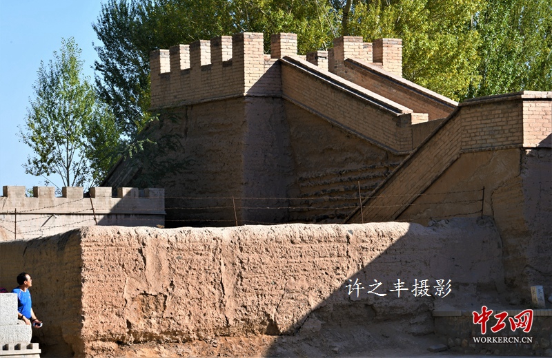 2019年9月29日,作者走进明长城悬壁段,位于嘉峪关关城北8公里处石关峡口的黑山北坡。始建于明嘉靖十八年(1539年)。因筑于约四十五度的山脊之上,形似凌空倒挂,因而得名“悬壁长城”。悬壁长城为嘉峪关西长城的重要地段,古为绿洲戈壁的分野之处,是古丝绸之路的必经关口,河西保障之咽喉,自古为重要的军事防御体系。工人日报-中工网许之丰摄影报道