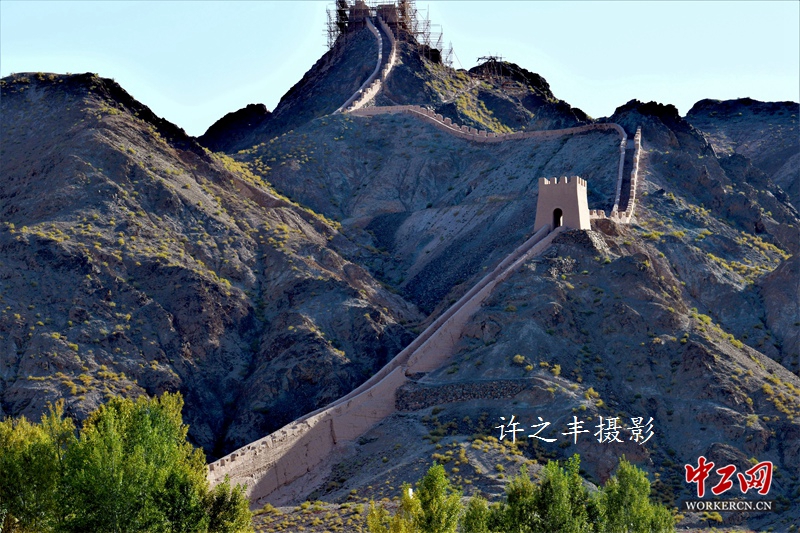 2019年9月29日,作者走进明长城悬壁段,位于嘉峪关关城北8公里处石关峡口的黑山北坡。始建于明嘉靖十八年(1539年)。因筑于约四十五度的山脊之上,形似凌空倒挂,因而得名“悬壁长城”。悬壁长城为嘉峪关西长城的重要地段,古为绿洲戈壁的分野之处,是古丝绸之路的必经关口,河西保障之咽喉,自古为重要的军事防御体系。工人日报-中工网许之丰摄影报道