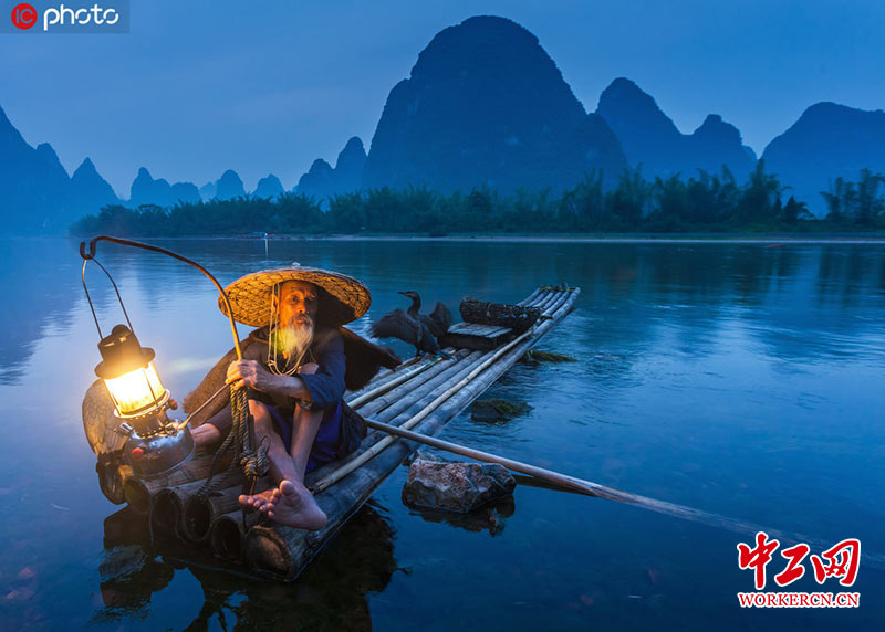 2015年4月7日报道(具体拍摄日期不详),桂林,在晨间月光的笼罩下,一位老渔民在江面上缓慢的划着小舟,载着鸬鹚,支着瓦斯灯,带着渔网,演绎着已有千年历史的捕鱼技法。