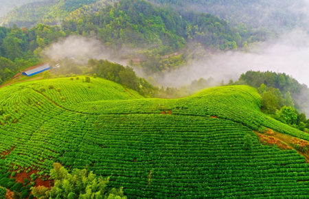 5月14日,仙居县上张乡滕庄1000多亩高山有机茶园云雾缭绕,构成了一幅美丽的乡村田园风光。