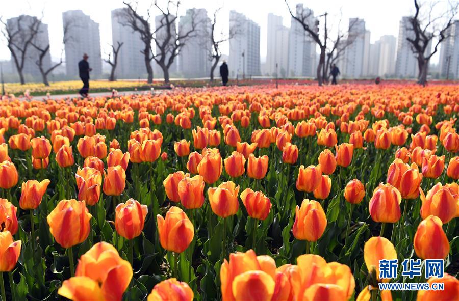 这是在永靖县城黄河南岸拍摄的黄河花堤景观带长廊中盛开的郁金香(4月27日摄)。