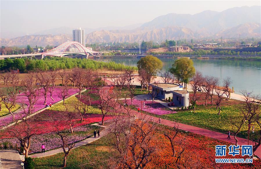 这是在永靖县城黄河南岸拍摄的黄河花堤景观带长廊(4月27日无人机拍摄)。新华社记者 范培珅 摄