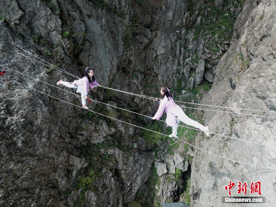 4月29日,“五一”小长假第一天,河南洛阳道教圣地老君山“飞拉达”项目建成迎宾,女导游身穿古装仗剑率先探路,飞檐走壁舞长剑,衣袂飘飘好似武侠片。中新社记者 王中举 摄