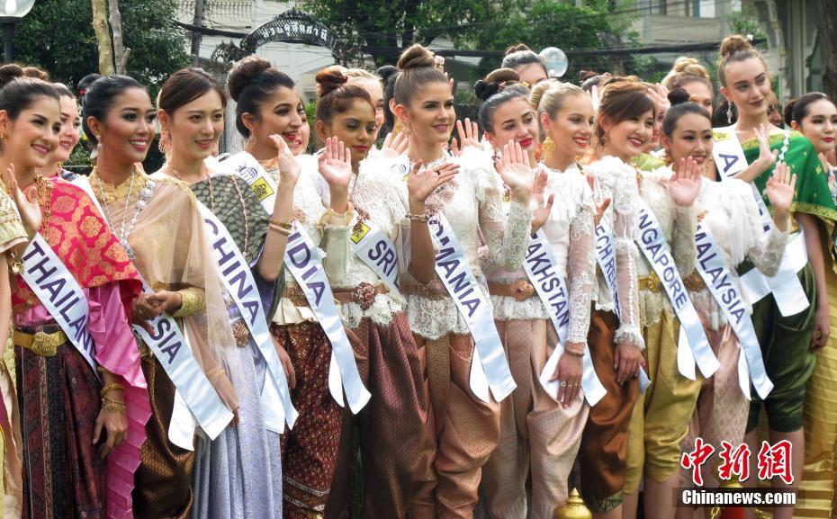 5月10日,2018年国际旅游小姐冠军总决赛在泰国曼谷举行,来自55个国家和地区的参赛佳丽在曼谷参观皇宫、寺庙、文化展览。图为参赛的中国佳丽吴丹(左三)与其他国家和地区的佳丽一同亮相曼谷。 中新社记者 钱兴强 摄