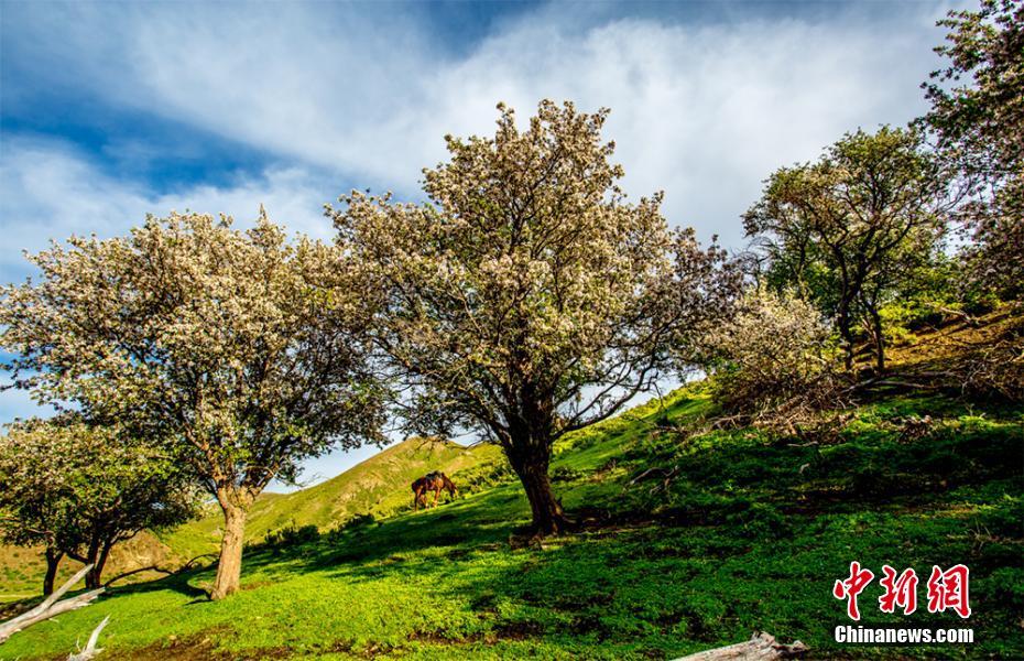 五月的新疆托里县果子沟景区,到处郁郁葱葱,各种野花竞相开放,漫步此地犹如置身于一幅清丽的山水画中,听风赏景,别有一番诗情与画意。果子沟景区位于托里县以北25公里处,因漫山遍野的野苹果而得名。夏季的果子沟,各种花儿争奇斗艳,穿行其间,浓郁的花香沁人心肺,令人陶醉。图为在野果树掩映下,果子沟显得更美。 帕力扎提 摄