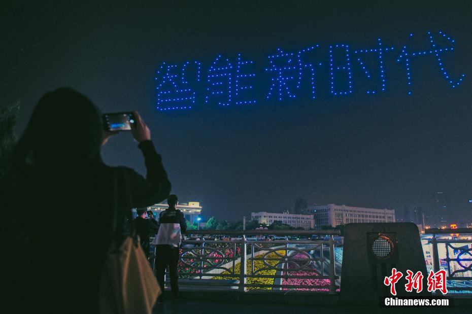 5月11日凌晨,天津站前广场,400架无人机上演3D互动立体编队表演,为即将在天津举办的第二届世界智能大会预热。据悉,本届智能大会将设置世界智能无人机展览。 中新社记者 佟郁 摄