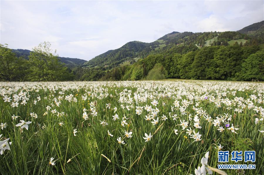 5月12日,在瑞士蒙特勒附近山区,大片红口水仙盛开。新华社记者徐金泉 摄