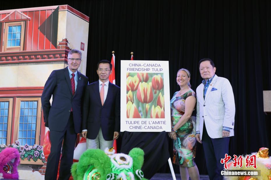 当地时间5月13日,在渥太华举行的2018年加拿大郁金香节迎来“中国日”特别活动。图为中国驻加拿大大使卢沙野(左二)与加拿大联邦华裔参议员胡子修(右一)、渥太华市长万晋思(Jim Watson,左一)等共同展示一款被大会组委会命名为“中加友谊”的红瓣黄边郁金香的照片。这株特别培育的郁金香预计将在2019年的中国北京世界园艺博览会和加拿大郁金香节上正式亮相。每年一度的加拿大郁金香节是北美春季规模最大的文化节庆活动之一。(中国驻加拿大大使馆供图)