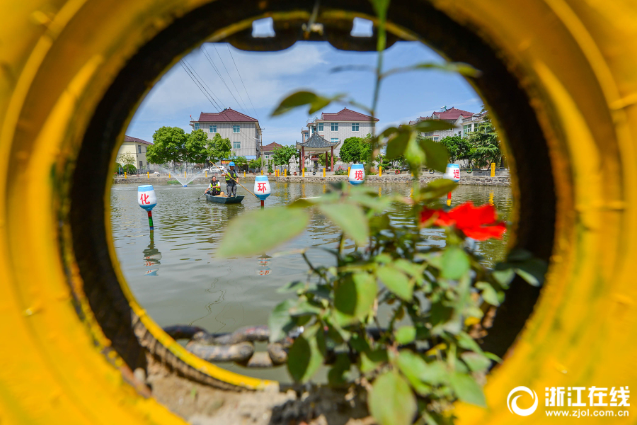 5月16日,长兴县李家巷镇许家浜村吴家潭碧水潺潺、绿意盎然,保洁人员正在进行护水作业。李家巷镇按照“一村一品”“一村一景”“一村一业”的要求,在美丽乡村建设过程中,不搞大拆大建,结合五水共治、垃圾分类、四边三化、三改一拆等工作,打造15个亮点水体,并充分利用旧轮胎、酒坛等废弃垃圾,对水体及村庄景观进行美化,打造美丽乡村升级版。