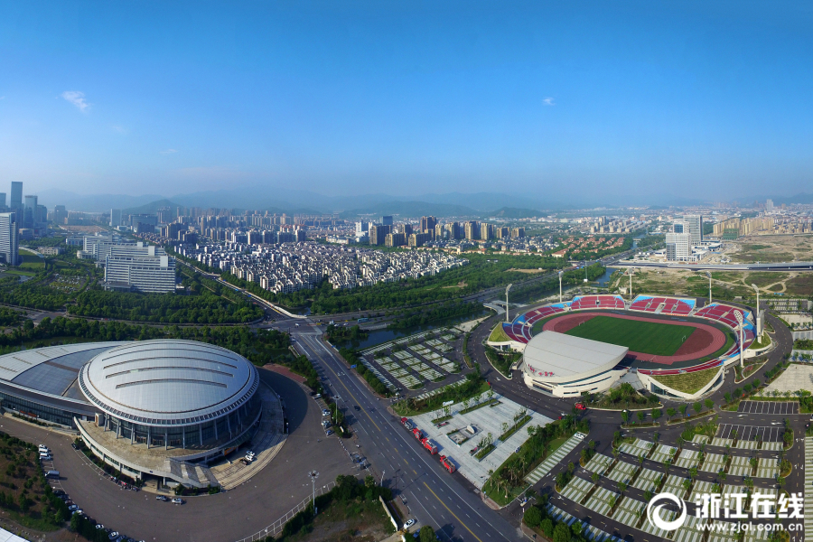 5月16日下午,蓝天映衬下的千岛新城舟山,高楼林立、河水清澈、绿化茂盛。