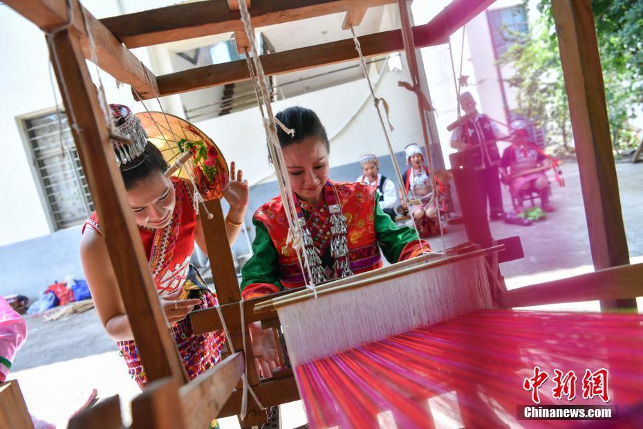 5月21日,海外华文媒体记者试穿“花腰傣”民族服饰并体验织布。当日,来自美国、加拿大、澳大利亚等国家的19家海外华文媒体一行来到云南省新平县嘎洒镇,采访了解当地“花腰傣”族的文化生活。这是“海外华文媒体感知中国行”云南采访活动中的一站,海外华文媒体将深入了解云南当地经济、社会、少数民族文化等方面的发展情况,亲身感受感知改革开放40年与“一带一路”建设中,中国边疆地区的发展变化与取得的成就。 中新社记者 任东 摄