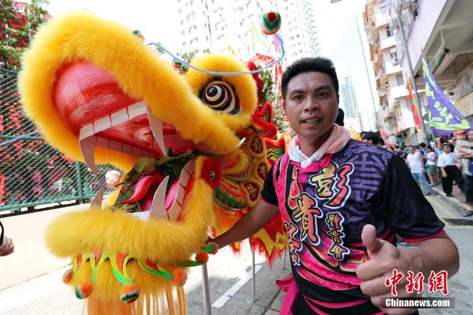 5月22日(农历四月初八)是香港民间庆典“谭公爷诞辰”,位于筲箕湾区的居民举行盛大贺诞飘色巡游,大街上锣鼓喧天,巨龙醒狮起舞,络绎于金华街、东大街至谭公庙一带为谭公爷贺寿,祝愿区内民丰物阜、社会安宁、小贩们安居乐业。香港五行小商贩福利会过去20年来,每年都举行盛大的贺诞典礼。筲箕湾谭公诞现已成为东区最大的旅游特色之一,吸引许多游客莅临观赏。图为舞龙头的壮汉。 中新社记者 洪少葵 摄