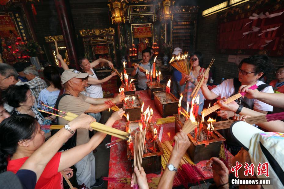 5月22日(农历四月初八)是香港民间庆典“谭公爷诞辰”,位于筲箕湾区的居民举行盛大贺诞飘色巡游,大街上锣鼓喧天,巨龙醒狮起舞,络绎于金华街、东大街至谭公庙一带为谭公爷贺寿,祝愿区内民丰物阜、社会安宁、小贩们安居乐业。香港五行小商贩福利会过去20年来,每年都举行盛大的贺诞典礼。筲箕湾谭公诞现已成为东区最大的旅游特色之一,吸引许多游客莅临观赏。图为香港市民在谭公庙烧香祈福。 中新社记者 洪少葵 摄