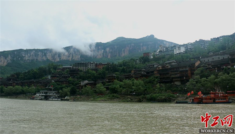 5月23日上午,参加“发现重庆之美:山水之城 美丽之地 2018全国重点网络媒体重庆行”活动的记者、编辑们在酉阳龚滩古镇乘船游览乌江画廊。龚滩古镇位于乌江与阿蓬江交汇处,隔江与贵州沿河县相望,是酉阳“千里乌江,百里画廊”的起点,从龚滩古镇沿乌江溯水而上,经土坨子峡、白芨峡,直至荔枝峡,是乌江百里画廊的精华,以“奇山、怪石、碧水、险滩、廊桥、纤道、悬葬”而著称。清代诗人翁若梅就曾写诗赞叹:“蜀中山水奇,应推此第一”。(中工网记者 谷永光摄影报道)