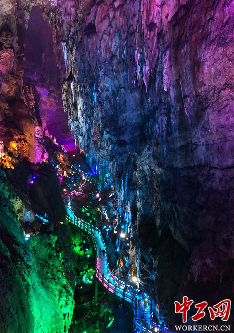 进入酉阳桃花源景区正门,迎面而来的就是太古洞。太古洞,又称为“桃源秘径”,长约3公里,距今已经有3亿多年历史,至今仍在不断生长发育。洞府体量庞大,气势磅礴,有曲折的廊道,险峻的峡谷,景观秀丽。洞内钟乳挺拔,石笋丛生,石幔高挂,石柱巍峨,经过灯饰精心点缀的溶洞,五彩缤纷,如梦似幻,堪称“地下桃花源”。