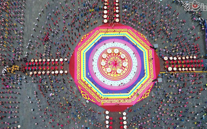 上万名苗家人穿着绚丽的苗族服饰汇聚在一起,从空中俯瞰,宛如一个流动的“五彩河流”。