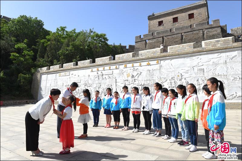 两名少先队员为滦平县妇联主席盖素玲和滦平青少年活动中心主任肖荣让系红领巾。