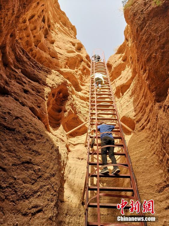 游人攀爬峡谷谷底的安全梯。吴学珍 摄